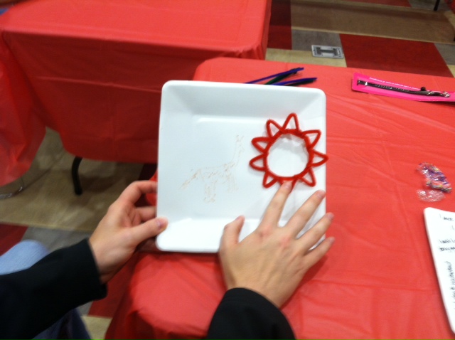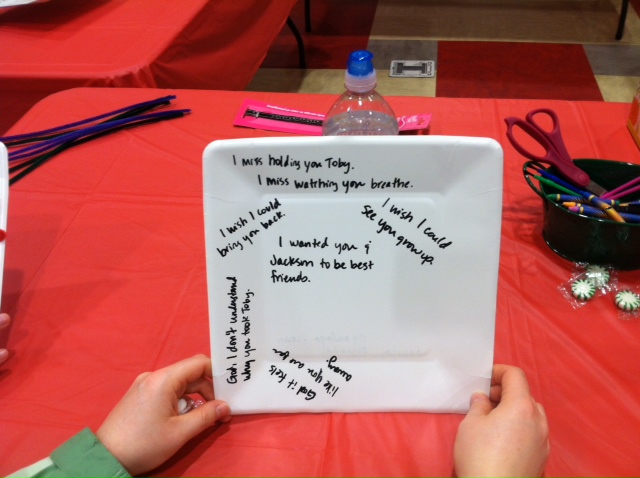 To respect the privacy of the attendees, this picture features a picture of a giraffe indicating the blanket that their twin son used to have with him in the NIC-Unit at the hospital before he died. What an awesome remembrance. In addition, the red object is the sun, which is an indicator of hope. What an amazing expression.